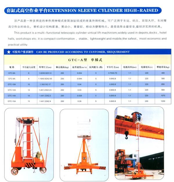 該產(chǎn)品是一種多用途的單作用伸縮式套簡油缸組成的垂直升降機(jī)械??蓮V泛用于車站、碼頭、賓館大廳、車間等高空作業(yè)的場合。整機(jī)設(shè)計(jì)結(jié)構(gòu)緊湊、晃動小、重量輕、移動方便等特點(diǎn),是登高作業(yè)安全,經(jīng)濟(jì)實(shí)用的機(jī)具。